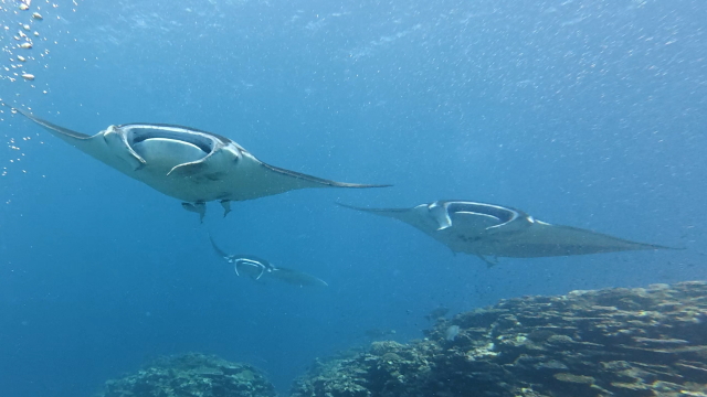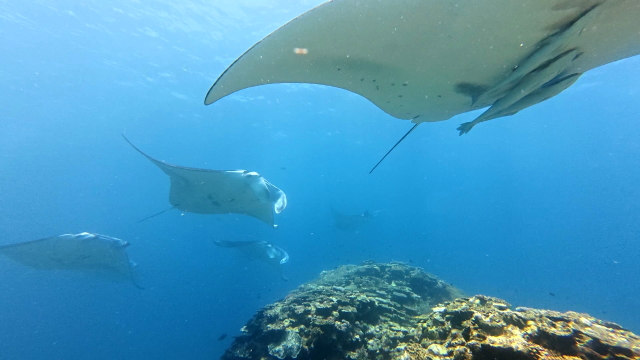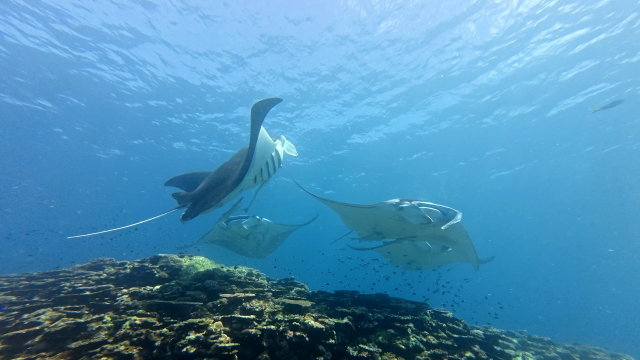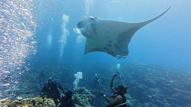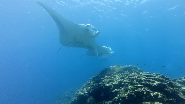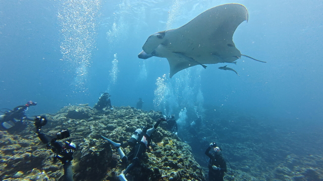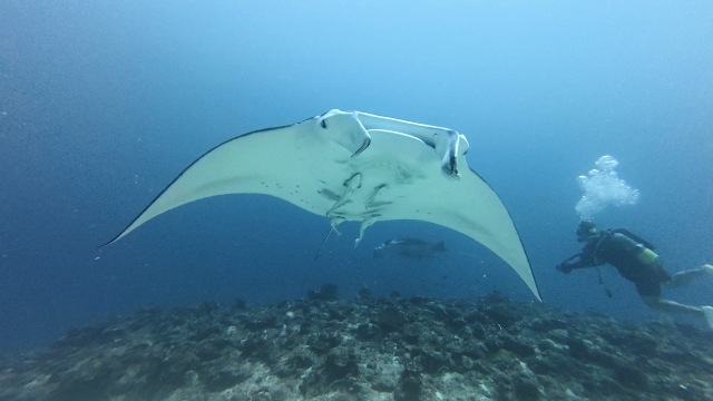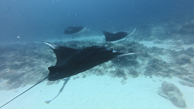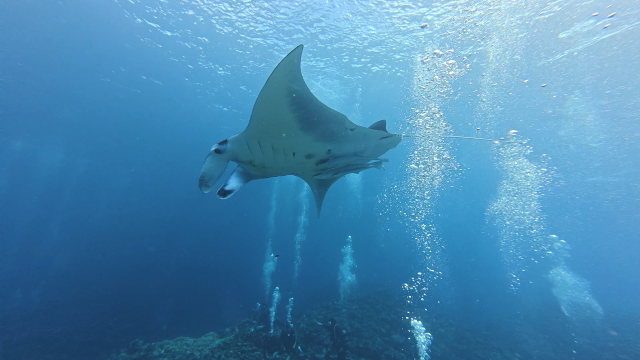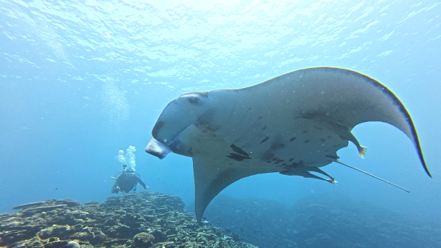 しばらく潜ってない間に水温が随分と上がって潜りやすくなりましたよ。今日は午前3匹。午後は5匹のマンタが出ました。2ダイブで7個体のマンタに遭遇です。 |