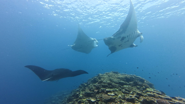 1本目は今日もマンタは出ませんでした。2本目はポイント待ちを2時間待ってのエントリー。早々に1匹(アンダバー)が出たけどメインの根を素通り。10分後別のマンタは(M1ネイサン)がメインの根でホバーリングするも4、5回旋回してこれまた東に消えた。それから延々とマンタ待ち。40分過ぎかな~。(M1ネーサン)が戻って来た。そこにもう1匹(コチョウ)が合流。やっとマンタをまともに見れたとさ。しかしポイント待ちに2時間は以上だね~。 |