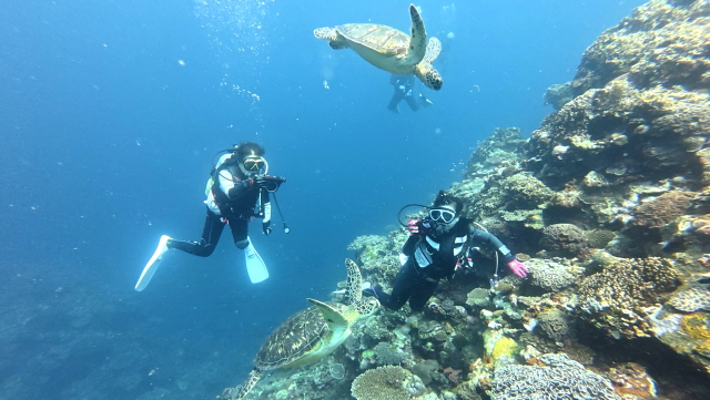 風が落ち着いて潜り易くなりました。今朝の石埼は朝からポイント待ちの船が5隻。待ちきれないで西の西辺りで潜りましたが亀2個体だけでマンタは見れず。午後は待ち時間なしで潜れたけど、マンタが出るまで60分。諦めないで良かったです。 |