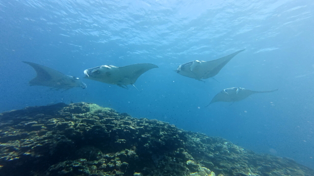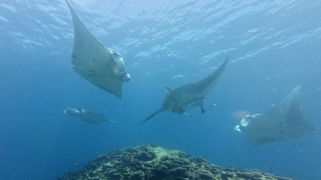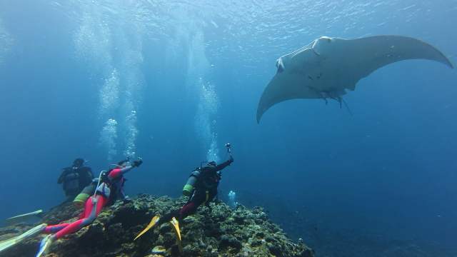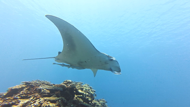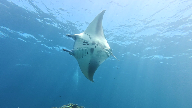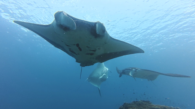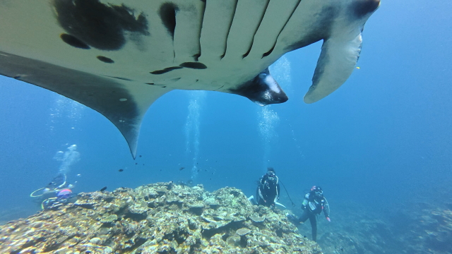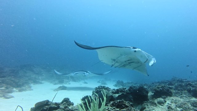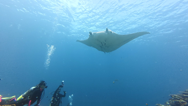 しばらく潜ってない間に水温が随分と上がって潜りやすくなりましたよ。今日は午前3匹。午後は5匹のマンタが出ました。2ダイブで7個体のマンタに遭遇です。 |