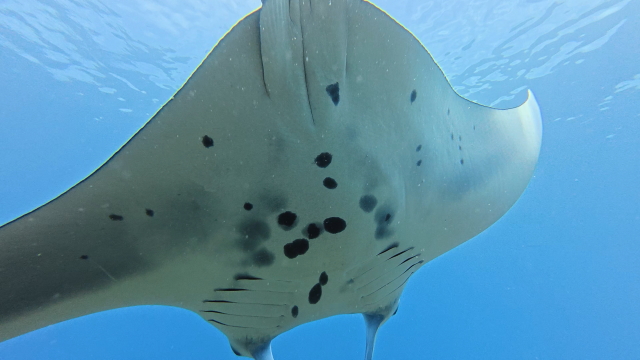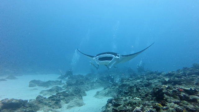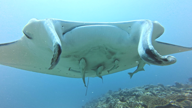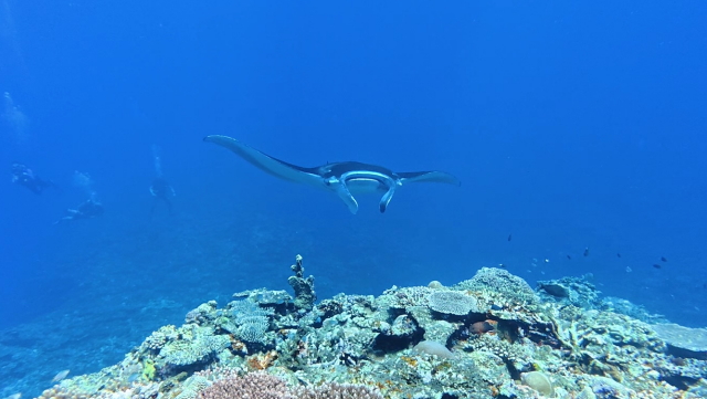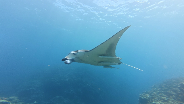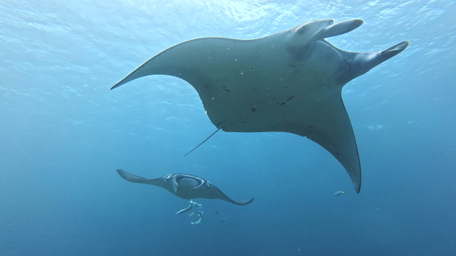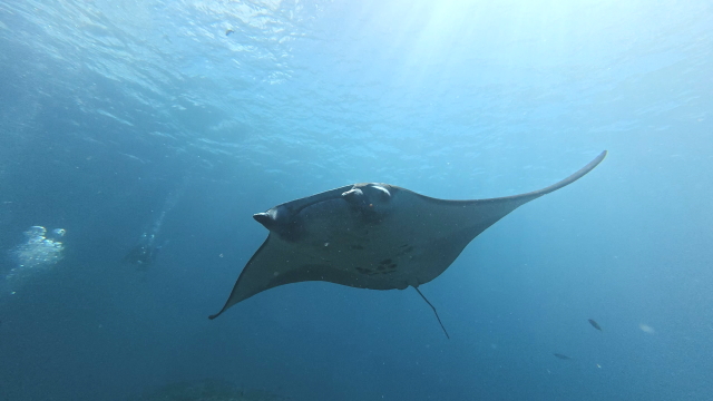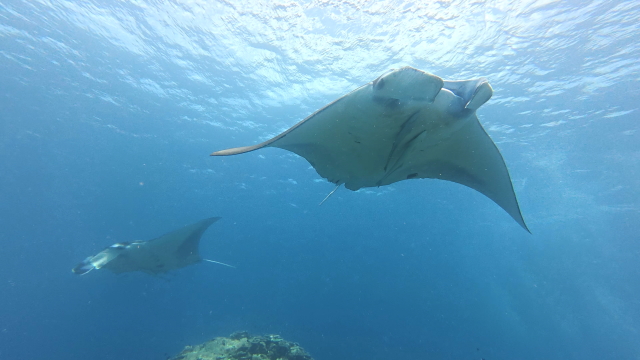 1本目は今日もマンタは出ませんでした。2本目はポイント待ちを2時間待ってのエントリー。早々に1匹(アンダバー)が出たけどメインの根を素通り。10分後別のマンタは(M1ネイサン)がメインの根でホバーリングするも4、5回旋回してこれまた東に消えた。それから延々とマンタ待ち。40分過ぎかな~。(M1ネーサン)が戻って来た。そこにもう1匹(コチョウ)が合流。やっとマンタをまともに見れたとさ。しかしポイント待ちに2時間は以上だね~。 |