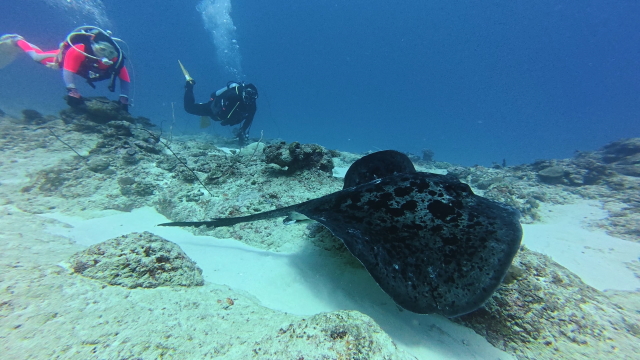 天気予報だと北風がそこそこ吹く予報だったので1本目は島の近くでカメ及びウスモモテンジュクダイを狙って見ました。午後も風が弱そうなので昨日のマンタリベンジに石崎に。ポイントは待ち船もなく空いてまいたね。エントリーして10分程で1匹(1,23)が出ました。メインの根に3回程行ったり来たり。してダイバーの頭上を通過、良い感じで見れてリベンジ成功でした。 |
