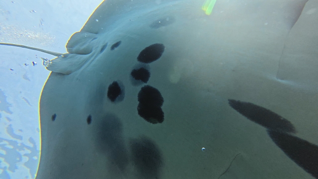 今日は今年最後のゲストを乗せて石埼マンタポイントに行って来ました。1本目エントリーしてメインの根に行くと既に2匹(ダイヤノメス、ラブ)がホバーリングをしていました。終始齧り付きでした。2本目はエントリー早々東の方から1匹(M1ネーサン)が向かって来て西の根に少し止まって東に旋回するのかなと思ったけど西に行って戻らず。メインの根に行くと2匹(ホワイティー、アイ)ホバーリングをしていて、時々ダイバーの周りを周回したり頭上を通過したりサービス満点。最後ホワイティーがメインとは別の浅い根に10分程ホバーリングをしていましたよ。2本目も終始齧り付きでした。 |