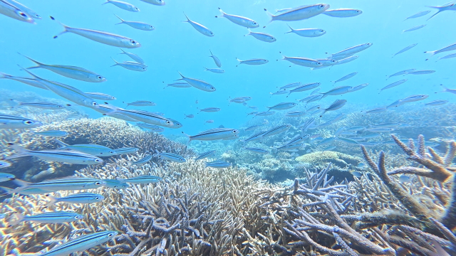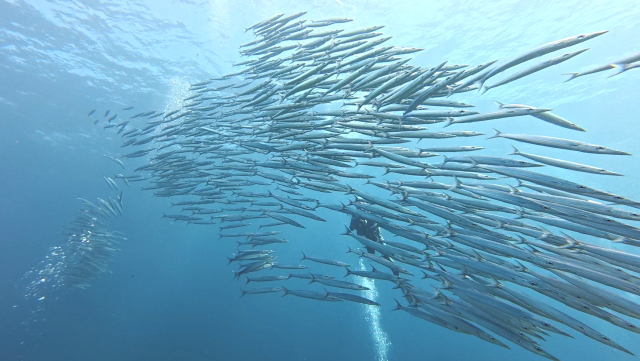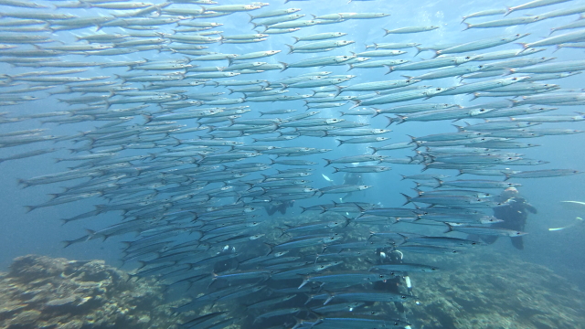 台風明け初日石埼に行ったけど、残念ながら午前及び午後もマンタは姿を現れず。マンタ待ちの間ホソカマスの群れを撮ったり、カメの写真を撮ったりして時間つぶし。この時期としては珍しくアイゴの群れが見れたとさ。 |